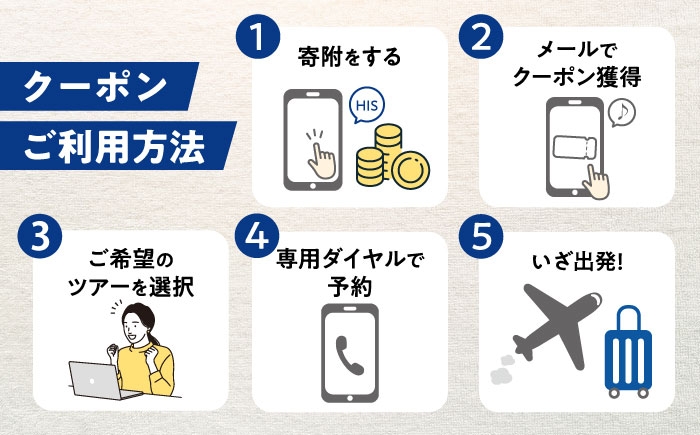 メール内に記載の「HISふるさと納税クーポン対象ツアー」より、ご希望の商品をお選びいただき専用ダイヤルにお電話ください。