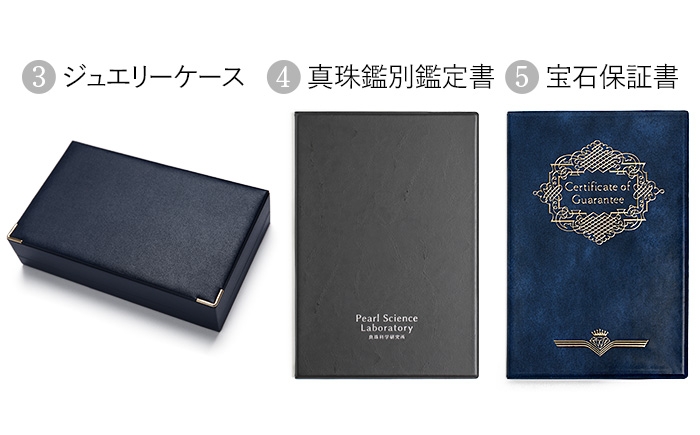 ・高級感あるレザー調のジュエリーケース(ネイビー)にセットしてお届けします。ご使用後の真珠の保管にも最適です。