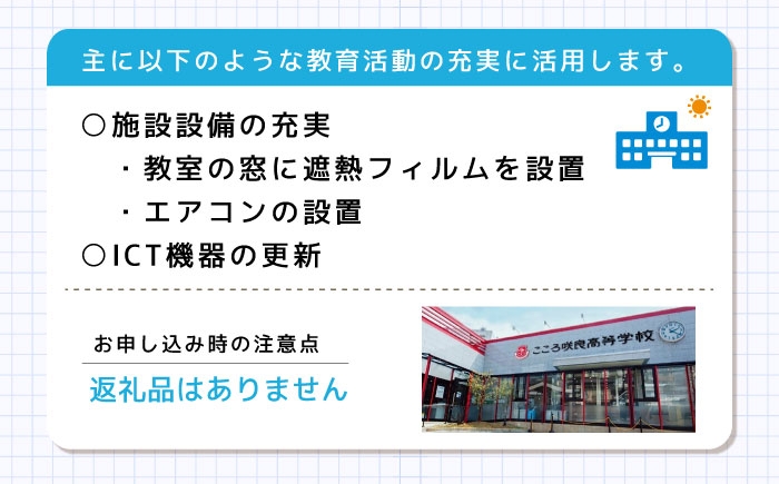 | 容量 | <こころ咲良高等学校>への寄附です。 ※返礼品はありません。 いただいた寄附金は、主に以下のような教育活動の充実に活用します。 ◯施設設備の充実 ・教室の窓に遮熱フィルムを設置 ・エアコンの設置 ◯ICT機器の更新 |