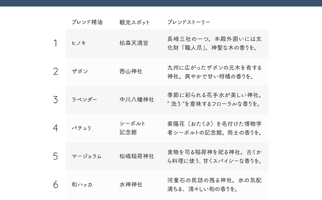 長崎市のエリアをテーマに、自社で独自に考案した配合にて精油の調香・充填・ラベル貼り・箱詰めまでの一連の工程を長崎市内で行ってるため。