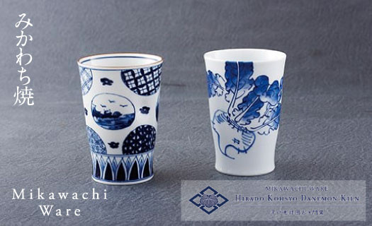 指がかけられて、にぎりやすくなっている手描きのフリーカップです G105a 〈平戸洸祥団右ヱ門窯〉染付一方押しフリーカップ2客