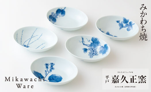 嘉久正窯は平戸藩御用窯の創立に力をなした中里茂右ヱ門(もえもん)を祖とする、350年前から続く窯元です。三代目茂ヱ門の三男が里見と姓を改め、藩御用窯として技術の研鑽に励み、三川内焼の中で、最も代表的な伝統技法の一つである手描きの染付(青華)技法を継承してきました。確かな線を重ねて、上品で繊細、淡く柔らかな染付が特徴です。