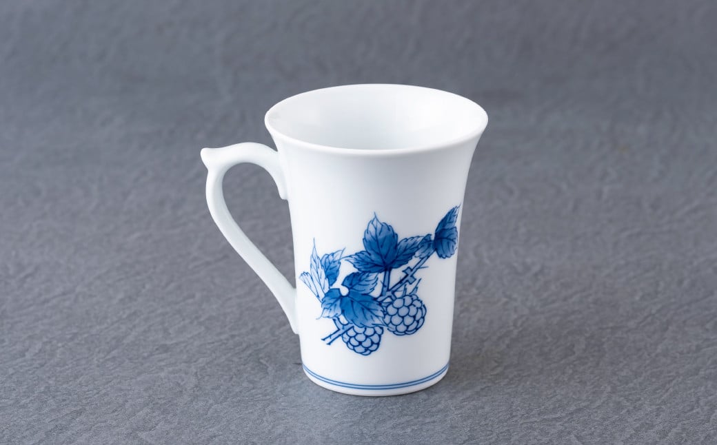 木苺が描かれたカップとプレートです。白磁に青の染付で描かれており、すっきりとした印象です。カップ、プレートともに使いやすい形と大きさです。