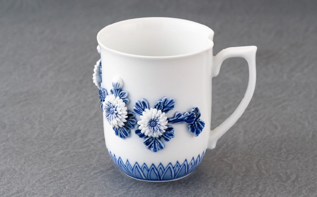 長崎県無形文化財に指定された平戸菊花飾の豪華絢爛なモーニング用マグカップです G174p 〈平戸洸祥団右ヱ門窯〉平戸菊花飾染付マグカップ