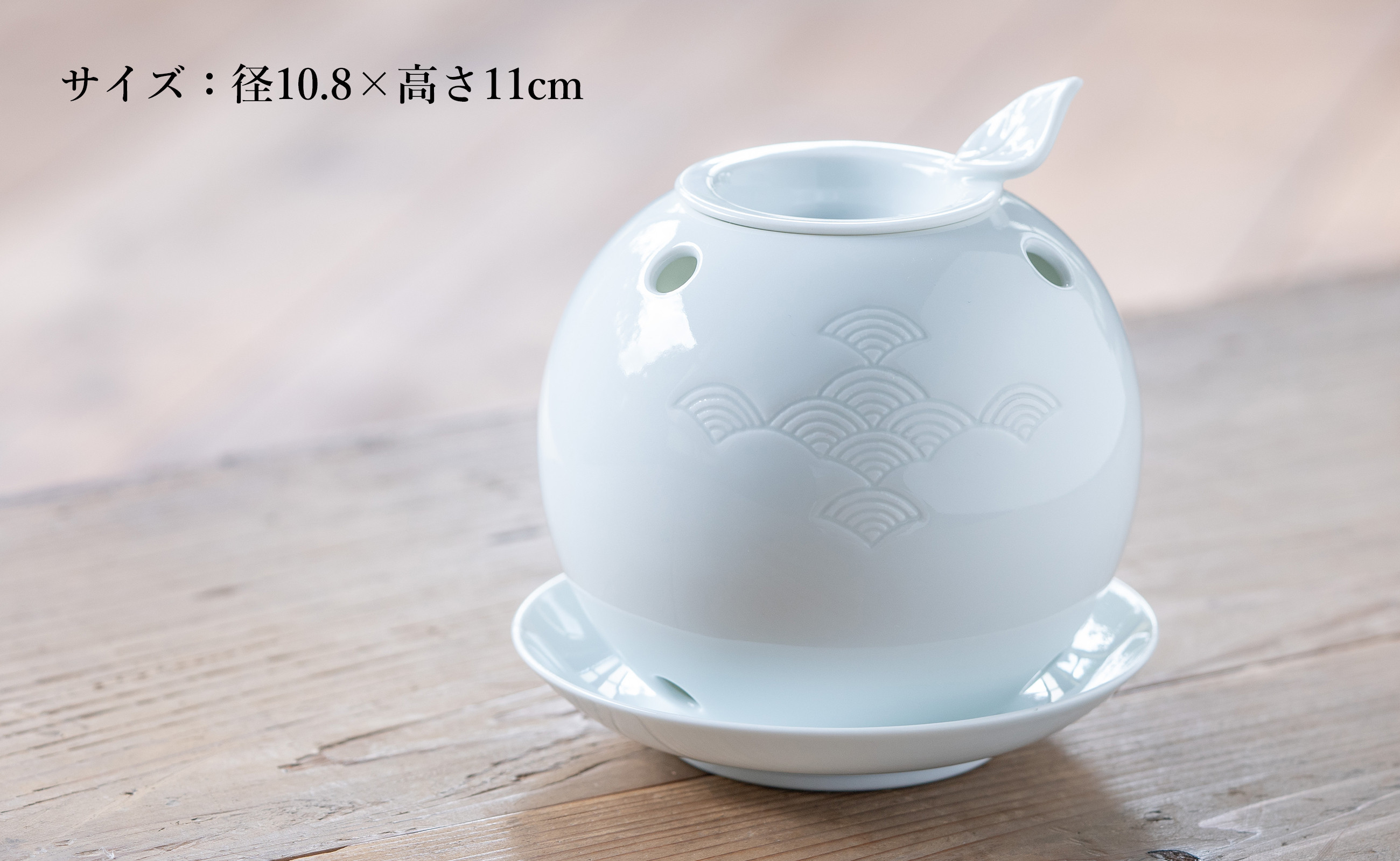 お茶の香り、あたたかい灯火、極上空間、白磁に浮かび上がる青海波がうつくしい茶香炉 G491p 〈平戸松山窯〉白磁彫り 茶香炉 1個 (世知原茶10g・キャンドル1個・説明書付き) 白磁陰刻
