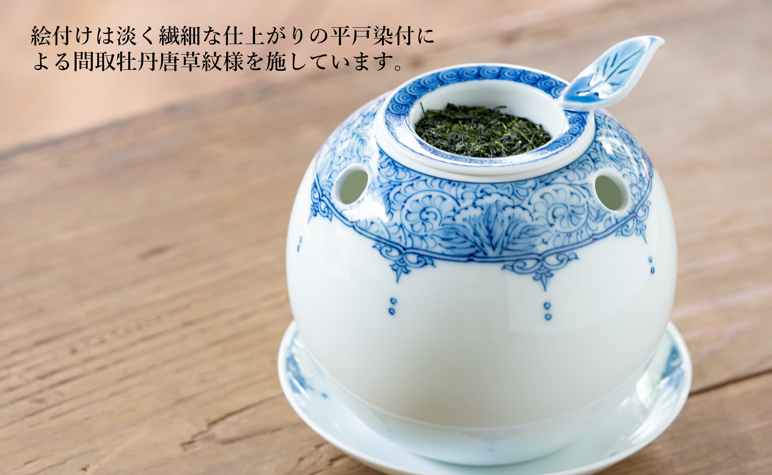 絵付けは淡く繊細な仕上がりの平戸染付による間取牡丹唐草紋様を施しています。