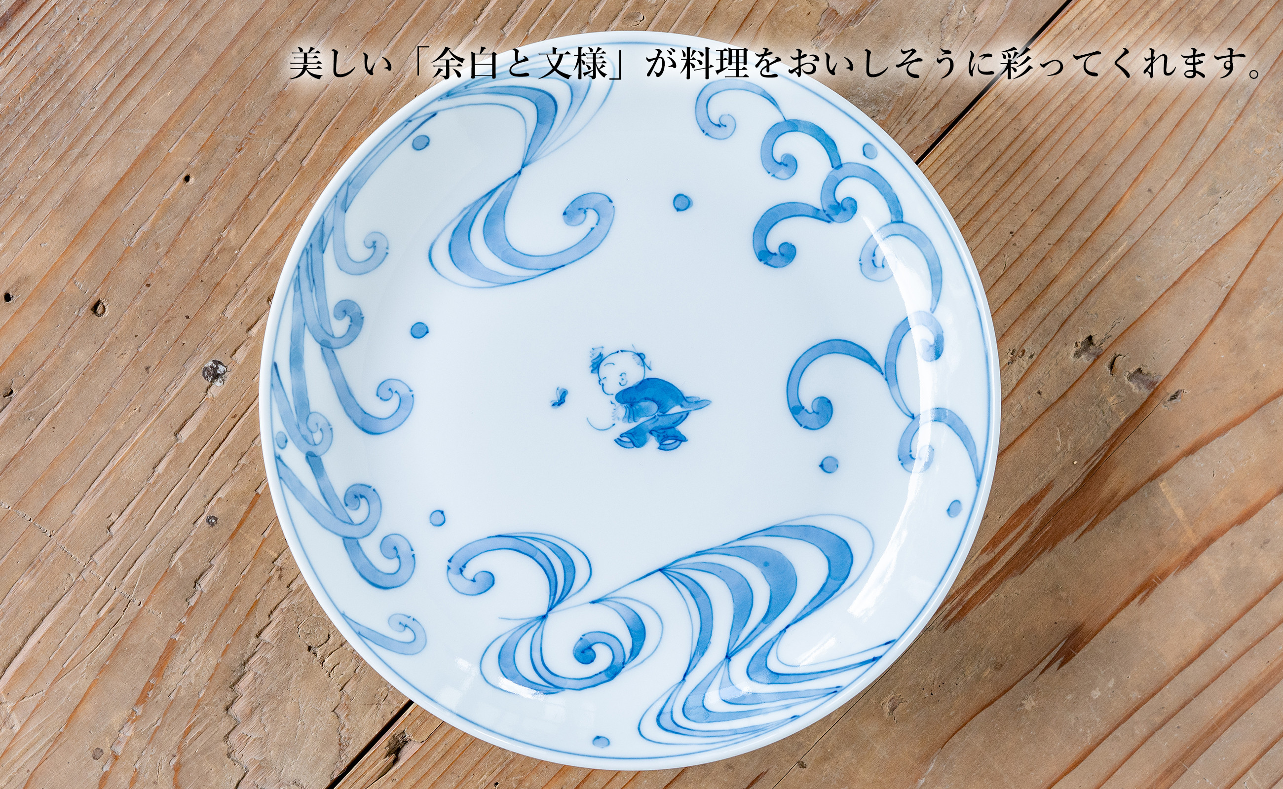 お皿の中心にワンポイントとして唐子が描かれているため、伝統的な絵柄でありながら、かわいらしい印象の中皿になっています。
