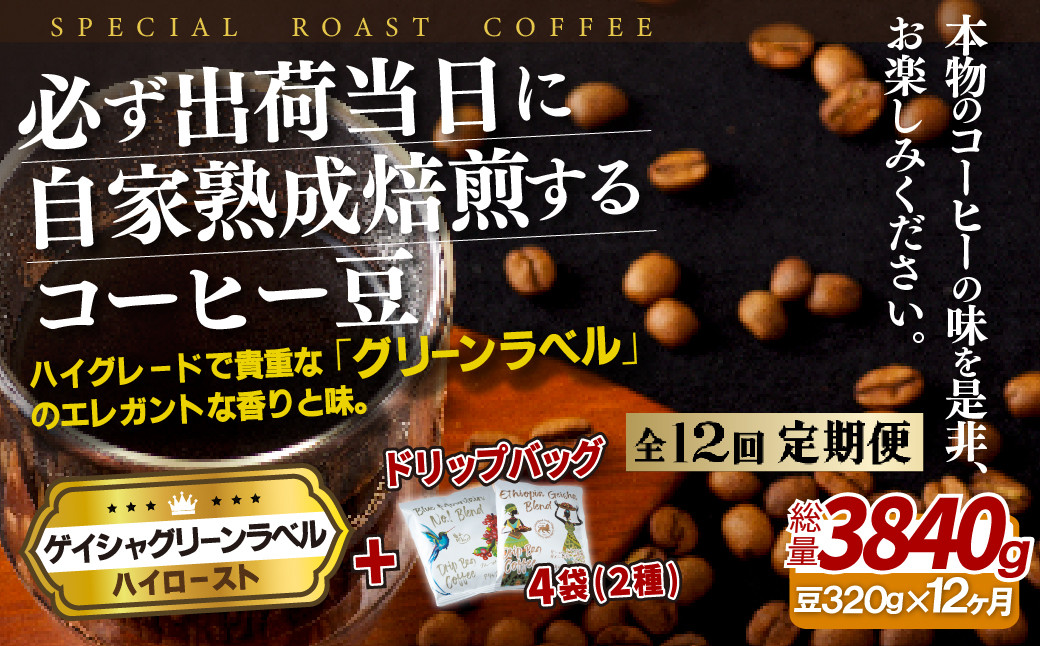 当日焙煎で鮮度抜群、世界を魅了したゲイシャグリーンラベル E250d 《定期便》必ず出荷日に自家熟成焙煎ゲイシャ豆(320g)+ドリップバッグ4パック【12回お届け】【SASEBO Coffee TOMINAGA】人気 新鮮 挽きたて 高級コーヒー 本格 希少 簡単