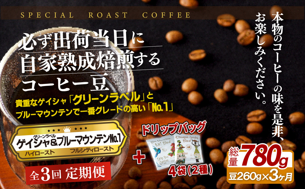 当日焙煎で鮮度抜群、ゲイシャグリーンラベルとブルーマウンテン№.1 E284d 《定期便》必ず出荷日に自家熟成焙煎ゲイシャ豆(160g)・ブルーマウンテン№1豆(100g)+ドリップバッグ4パック【3回お届け】【SASEBO Coffee TOMINAGA】人気 新鮮 挽きたて 高級コーヒー 本格 希少 簡単