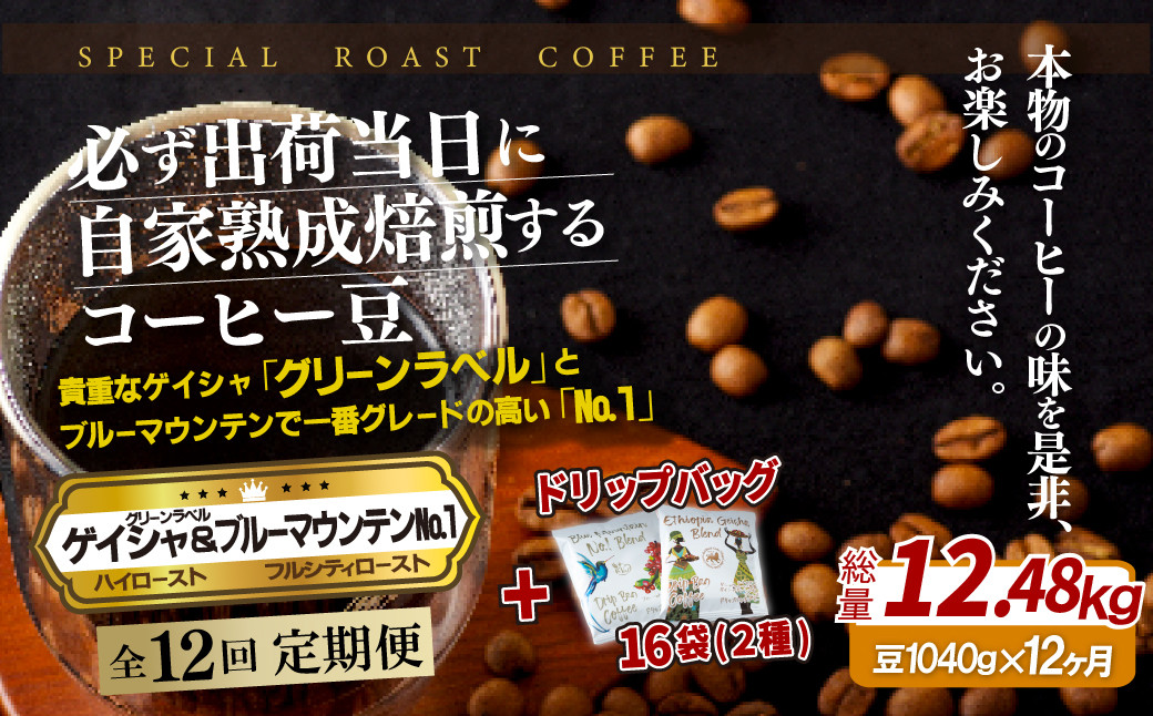 当日焙煎で鮮度抜群、ゲイシャグリーンラベルとブルーマウンテン№.1 E298d 《定期便》必ず出荷日に自家熟成焙煎ゲイシャ豆(640g)・ブルーマウンテン№1豆(400g)+ドリップバッグ16パック【12回お届け】【SASEBO Coffee TOMINAGA】人気 新鮮 挽きたて 高級コーヒー 本格 希少 簡単