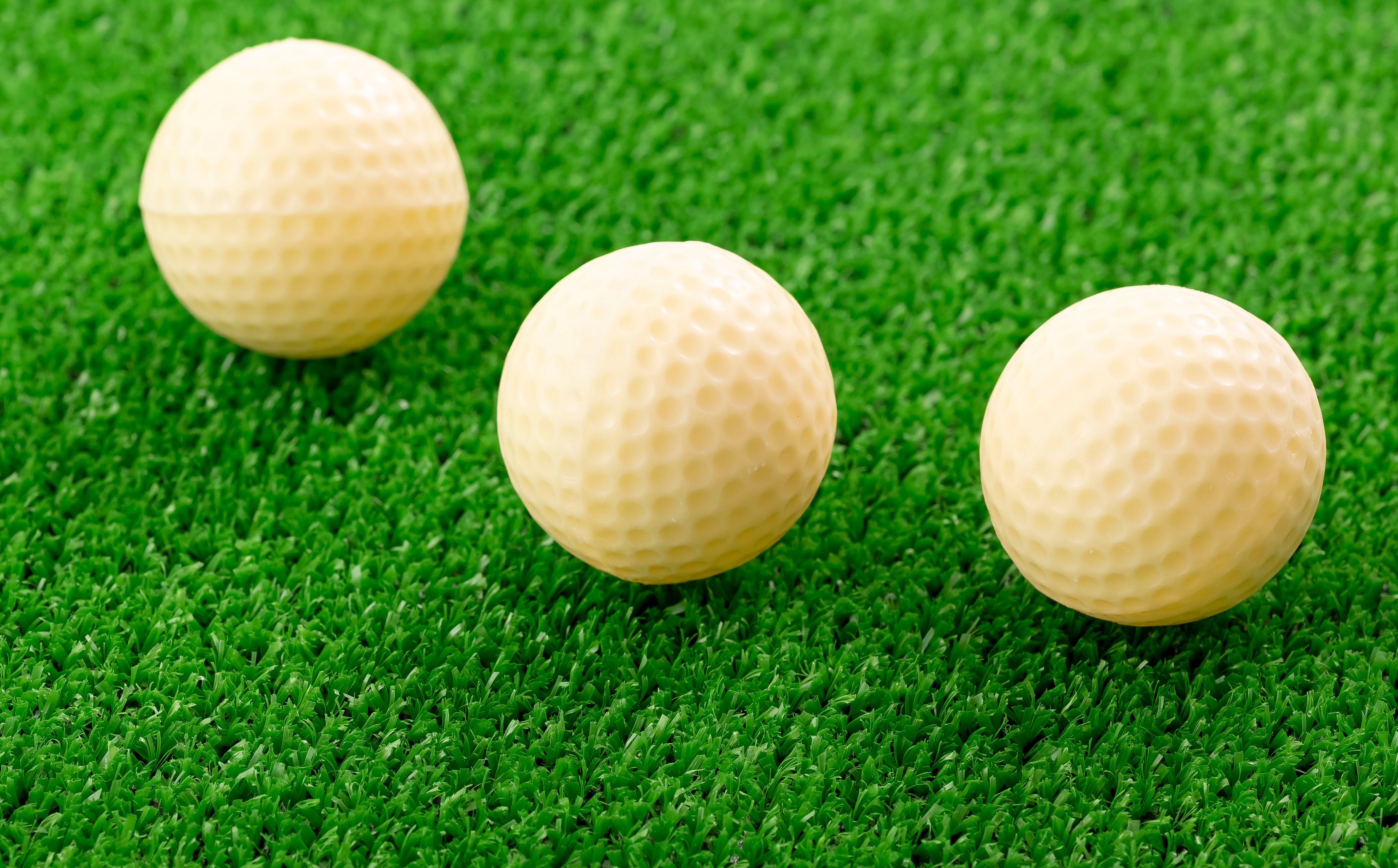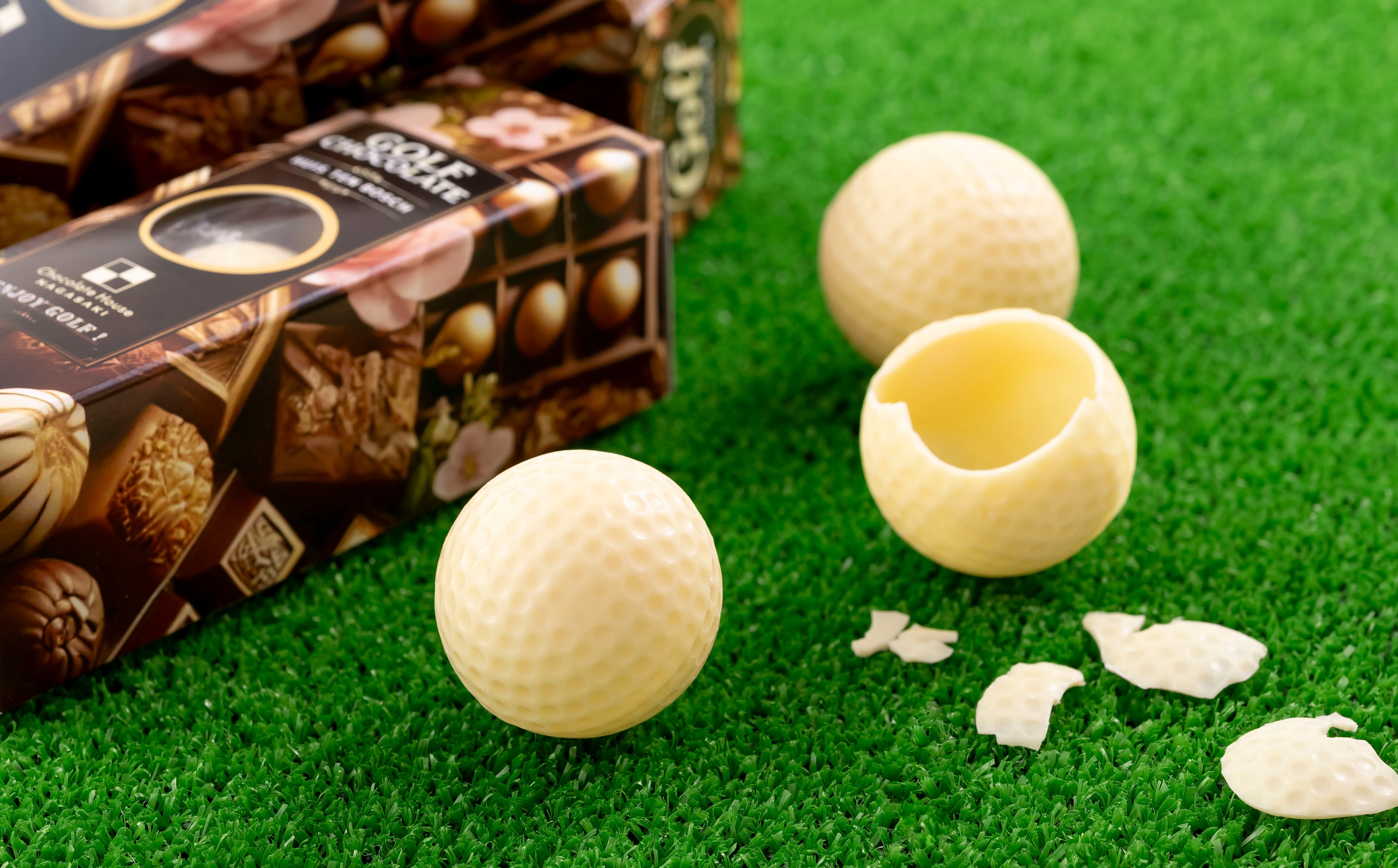 ホワイトチョコレートでゴルフボールを作り、箱に縦に3個入れ、よりリアルなゴルフボールに見えるようにしました。