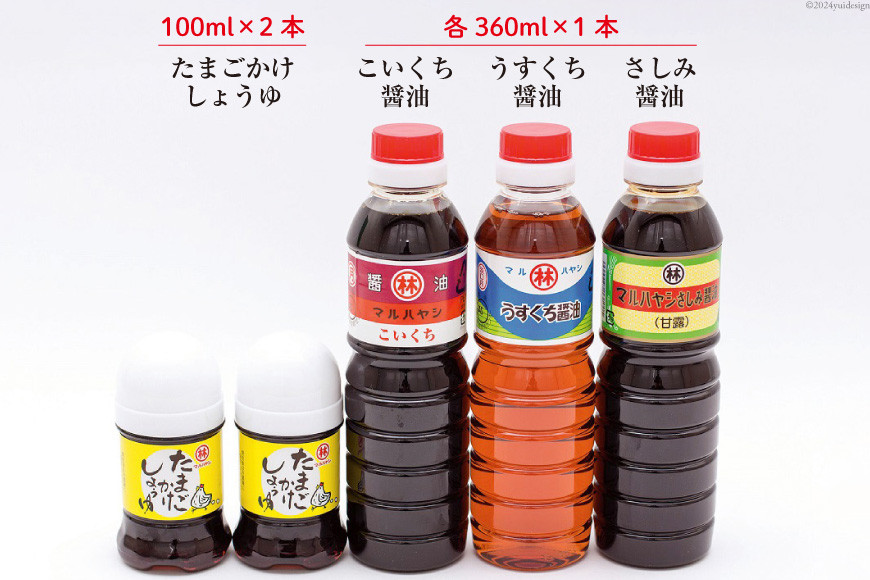 | 容量 | ・こいくち醤油・うすくち醤油・さしみ醤油各360ml×1本 ・たまごかけしょうゆ100ml×2本 |