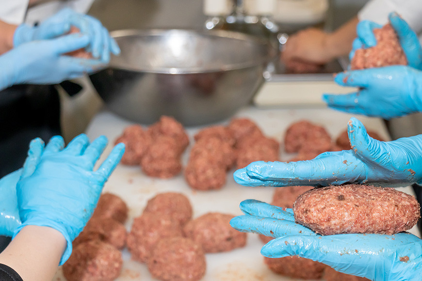 宮崎「一頭の塊肉から赤身が多い部分と脂身が多い部分を分けます。ハンバーグで食べた時に、うま味が増すように計算しながら赤身と脂身のバランスを微調整します。カットした肉は成形して一晩寝かせ、次の日にミンチにし一旦冷やしハンバーグの形に手ごねして整え、さらに一晩じっくり冷やします。」