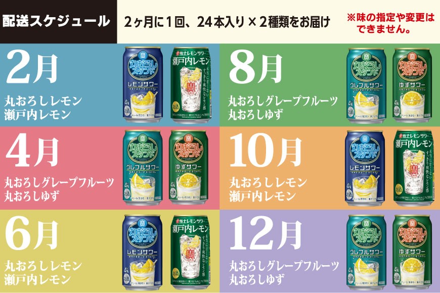 | 容量 | 下記を偶数月に1回(全6回)お届け 各月350ml 24本入×2箱 合計288本 ■2月 ・丸おろしスタンド<レモンサワー> ・極上レモンサワー<瀬戸内レモン> ■4月 ・丸おろしスタンド<グレフルサワー> ・丸おろしスタンド<ゆずサワー> ■6月 ・丸おろしスタンド<レモンサワー> ・極上レモンサワー<瀬戸内レモン> ■8月 ・丸おろしスタンド<グレフルサワー> ・丸おろしスタンド<ゆずサワー> ■10月 ・丸おろしスタンド<レモンサワー> ・極上レモンサワー<瀬戸内レモン> ■12月 ・丸おろしスタンド<グレフルサワー> ・丸おろしスタンド<ゆずサワー> |