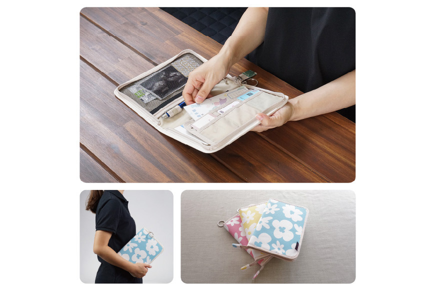 マルチケース(ファスナータイプ)は、母子手帳ケース、お薬手帳ケース、通帳ケース、年金手帳ケース、パスポートケース、カードケース、書類ケース、バッグなど様々な用途でお使いいただけます。