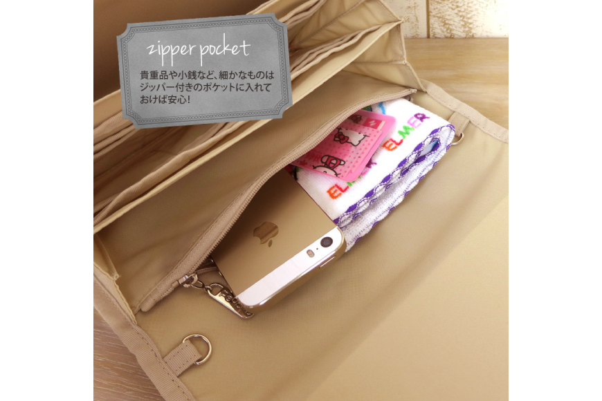 背面にも収納ポケットを設けていますので、スマートフォンやハンカチなど、すぐに出したいものを収納する際に重宝します。