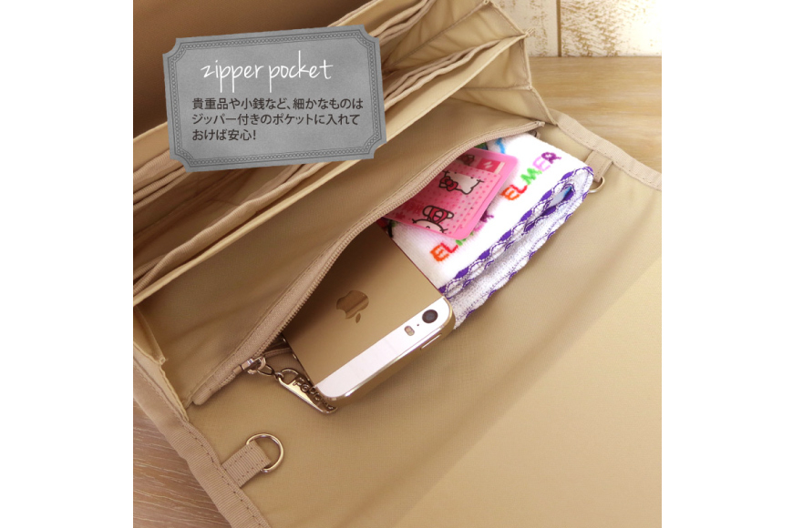 背面にも収納ポケットを設けていますので、スマートフォンやハンカチなど、すぐに出したいものを収納する際に重宝します。
