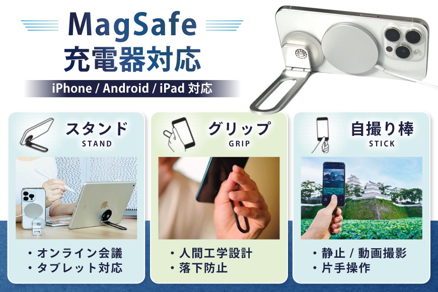 • MagSafe 充電器対応:3M VHB テープ固定式で、本体を外さず充電可能。充電しながらオンライン会議や動画視聴、ゲーム、レシピ確認や資料閲覧も快適。
