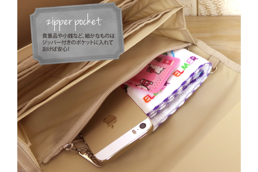 背面にも収納ポケットを設けていますので、スマートフォンやハンカチなど、すぐに出したいものを収納する際に重宝します。