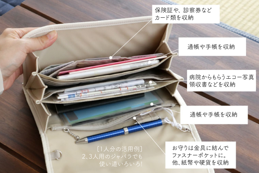 マルチケース(ジャバラタイプ)は、母子手帳ケース、お薬手帳ケース、通帳ケース、年金手帳ケース、パスポートケース、カードケース、書類ケース、バッグなど様々な用途でお使いいただけます。