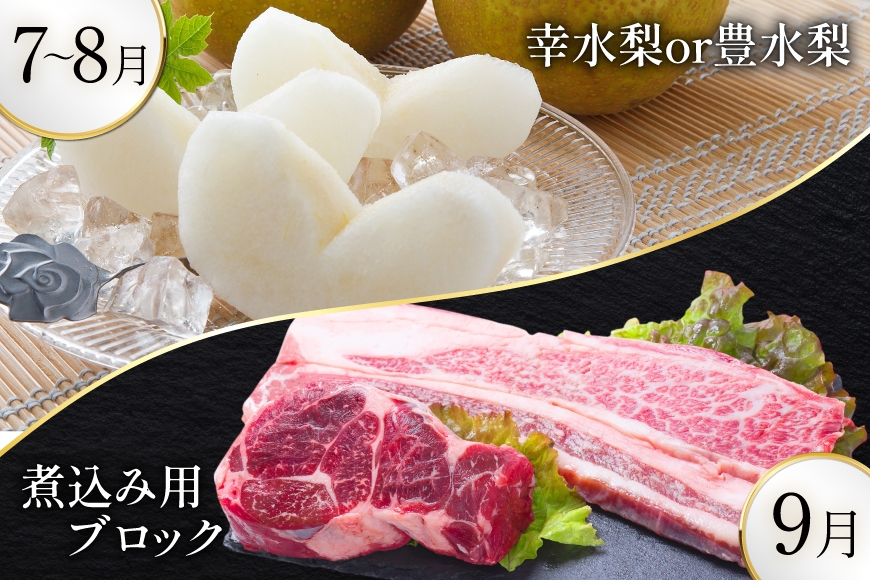 | 容量 | 下記を2月、4月、5月、6月、7〜8月、9月、10月、12月に発送(全8回)お届け ・2月:サーロインステーキ 400g ・4月:ハウスビワ 500g ・5月:ハウスうり坊 約8kg ・6月:島原風香 約5kg ・7〜8月:幸水梨or豊水梨 5kg ・9月:煮込み用ブロック: 800g (バラ肉400g、すね肉400g) ・10月:焼き肉・すき焼き用: 600g (もも) ・12月:ステーキ3種盛: 600g (もも200g、トモサンカク 又は シキンボ200g、サーロイン200g) ■原産地 ・フルーツ:長崎県島原市産 ・長崎和牛:長崎県産 【加工地】 長崎県南島原市 |