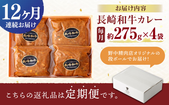 お肉が主役!満足度100%のカレー。 《レビューキャンペーン実施中》【12回定期便】 【肉のプロが贈る 究極のカレー】長崎和牛 A5 カレー 約275g×4袋 / カレーライス かれー レトルト 牛 和牛 / 諫早市 / 野中精肉店 [AHCW100]