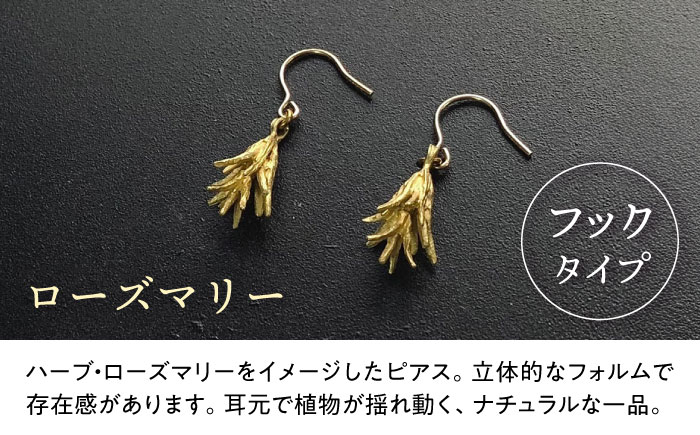 ハーブ・ローズマリーをイメージしたイヤリング。 立体的なフォルムが存在感あります。 耳元で植物が揺れ動く、ナチュラルな一品。 ピアスはフックタイプ、イヤリングはフープタイプでご用意しています。 ■保管方法 保管の際は密封できる袋にいれて空気を遮断すると色変わりが抑えられます。 イヤリング