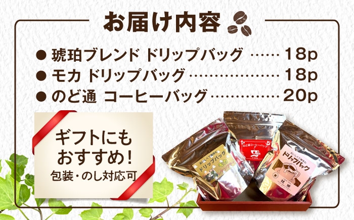 手軽に本格コーヒーの飲み比べができるセット 琥珀珈琲 3種 詰め合わせ 計56杯分(ドリップバッグ18p・のど通コーヒーバッグ20p・ドリップバッグモカ18p) / コーヒー 自家焙煎 ドリップ パック バッグ 珈琲 こーひー インスタントコーヒー モカ コーヒーギフト ティーバッグ型 詰め合わせ/ 大村市 / かとりストアー [ACAN148]