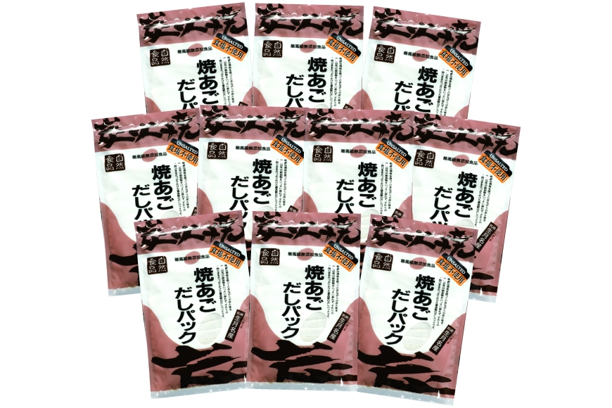 焼あごを細かく粉砕し、ティーバッグ形式に加工。1袋(10g)で約4人分(500ml程度)のだしが簡単にとれ、お味噌汁やお吸い物、茶碗蒸しなど幅広い料理に対応。
