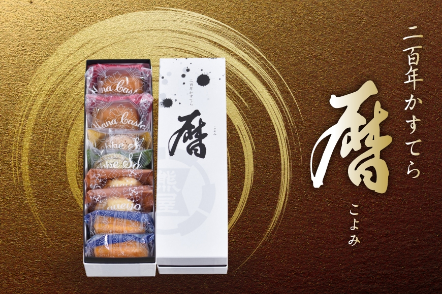 熟練職人が丁寧に焼き上げた「二百年かすてら 暦」と、南蛮文化と茶道の精神、熊屋の技を融合させた焼菓子を詰め合わせました。