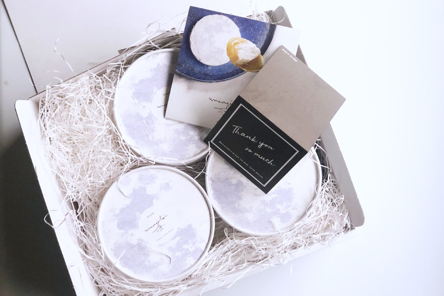 漆黒の箱に浮かぶ満月のような佇まい。説明カードやメッセージも添えられます。
