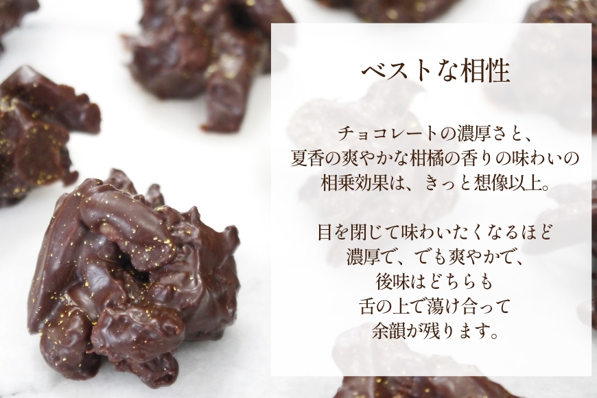 ビターチョコレートがベストな相性なのは、それくらい夏香の香りと味わいが際立って高いから。チョコレートの濃厚さと、夏香の爽やかな柑橘の香りの味わいの相乗効果は、きっと想像以上。目を閉じて味わいたくなるほど濃厚で、でも爽やかで、後味はどちらも舌の上で蕩け合って余韻が残ります。
