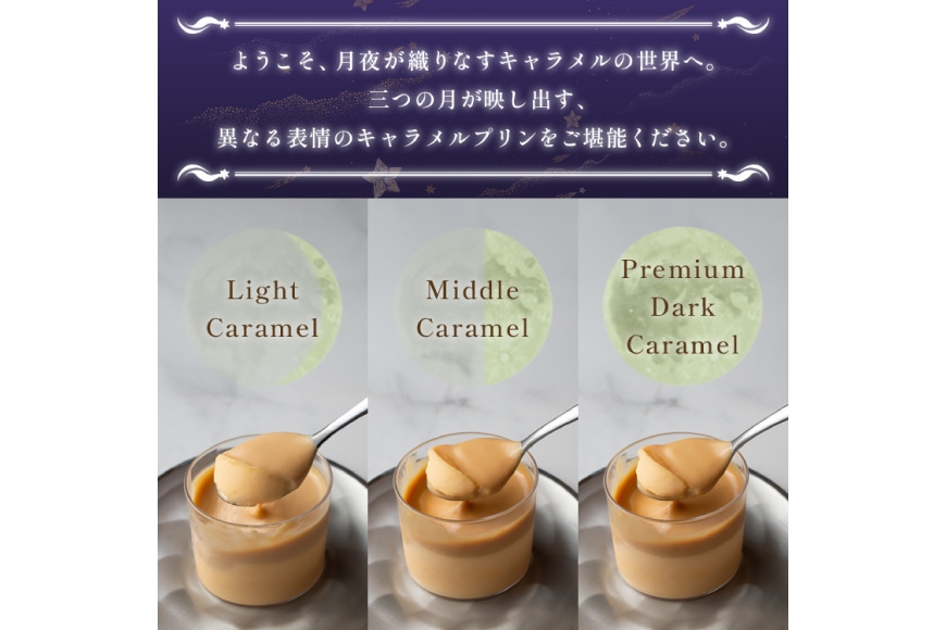 シグネチャーキャラメルを、light、middle、premium darkの3つの濃度にして、マスカルポーネとクリームチーズを使った、もっちりとしたプリンに合わせました。