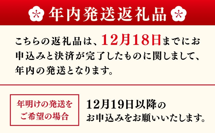 1カ月以内 ※年始は1月中旬頃より順次発送となります。この期間は、通常よりもお届けにお時間をいただく場合がございますので、あらかじめご理解、ご協力をお願いいたします。 【年内発送返礼品】 こちらの返礼品は、12月18日までにお申し込みと決済が完了したものに関しまして、年内の発送となります。 ▼年明けの発送をご希望の場合 12月19日以降のお申し込みをお願いいたします。 ◆お歳暮の贈り物◆ 本返礼品は、お歳暮の贈答用としてお申し込みいただけます! お歳暮ご希望の方は、【12月1日までに】お申し込みをお願いいたします。 ※お申し込みの際には、【備考欄】に「お歳暮」との文言をご記載いただくようお願い申し上げます。 ※返礼品は12月下旬までにお届けいたしますが、配送の混雑状況により遅れる場合がございます。何卒ご了承くださいませ。 ※発送の際は、熨斗を付け、伝票の依頼主名に「寄附者名」または「事業者名」を記載した上で発送いたします。 ※ふるさと納税に関するお礼状・リーフレット等の同梱や、それに関わる記載はせずにお届けさせていただきます。 |