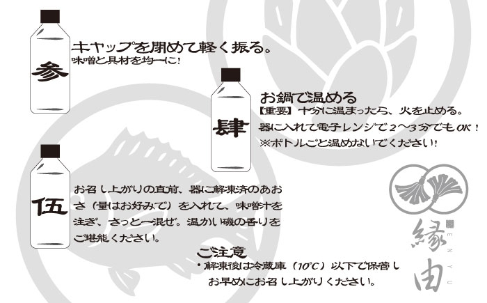| 容量 | 以下の内容を全6回(毎月1回)お届けします。 天然クエ入り味噌汁350ml×2本、天然鯛入り味噌汁350ml×2本、天然亀の手入り贅沢味噌汁350ml×2本、冷凍生あおさ3パック 【原料原産地】 壱岐産 【加工地】 壱岐 |