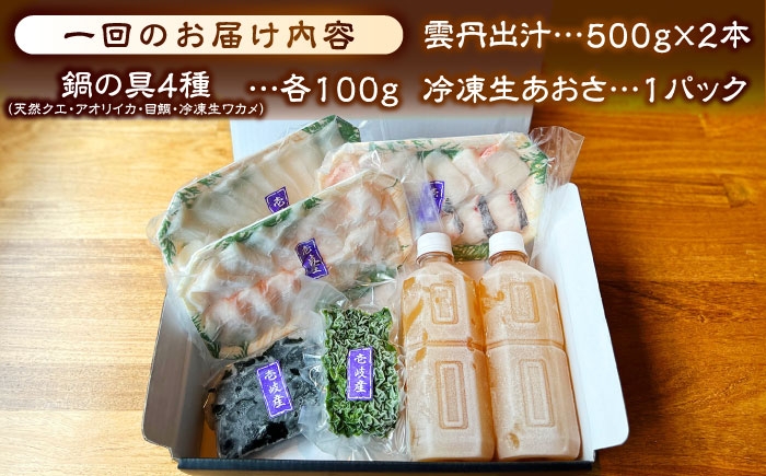 | 容量 | 以下の内容を全2回(毎月1回)お届けします。 雲丹出汁500g×2本、クエ100g、アオリイカ100g、目鯛100g、冷凍生ワカメ100g、冷凍生あおさ1パック 【原料原産地】 壱岐産 【加工地】 長崎県壱岐市 |