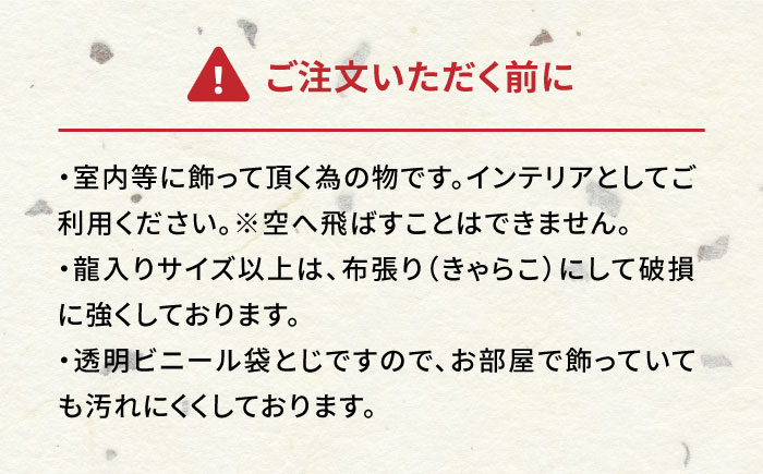 | 容量 | 縦:約120cm 横:約80cm 【ご注意事項】 ●室内等に飾って頂く為の物です。インテリアとしてご利用ください。※空へ飛ばすことはできません。 ●龍入りサイズ以上は、布張り(きゃらこ)にして破損に強くしております。 ●透明ビニール袋とじですので、お部屋で飾っていても汚れにくくしております。 ●ネーム入りご希望の方は申込の際に備考欄に、ご希望のお名前を記入してください。 寄付受付後に「五島民芸」より寄付者様へご連絡いたします。 |