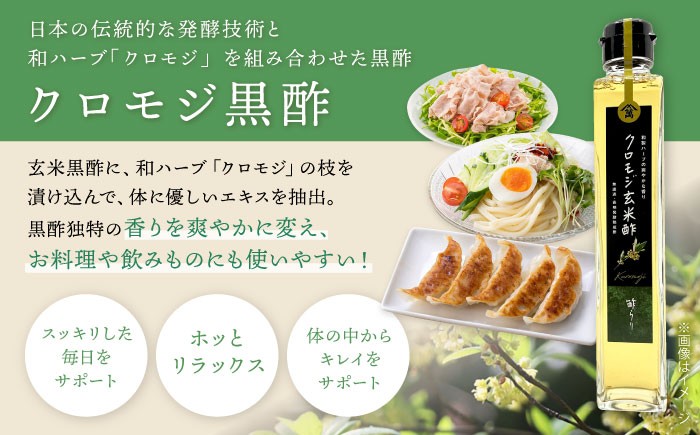 クロモジ玄米酢は、栽培期間中農薬不使用の栽培米の玄米麹を原料として造った玄米酢に和ハーブ『クロモジ』を漬け込むことで、長期熟成もろみ酒仕込みのお酢にある独特の香りが少なく、玄米酢の旨味を残しながらクセのない爽やかなお酢に仕上がっております。