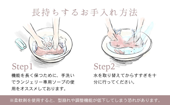肌なじみや伸縮性が良く身体に負担の少ないゴムを採用し、ホックを4段階にすることでサイズ調整が2cm幅で可能に