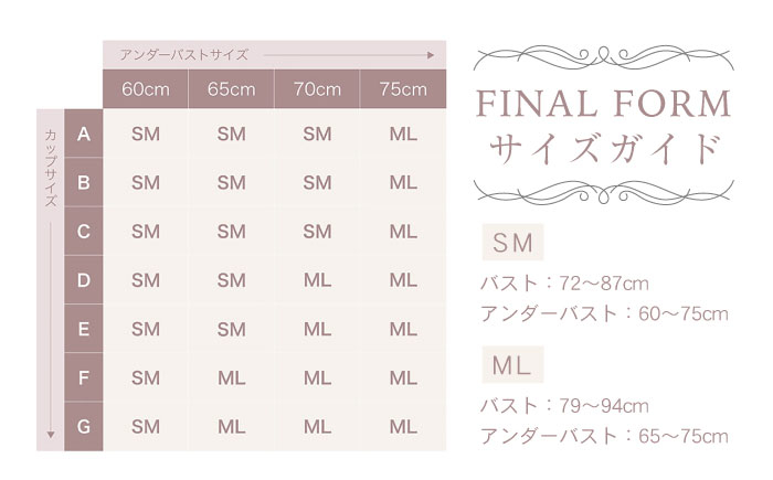 | 容量 | FINAL FORM ナイトブラ ブラジャー単品 Black 品質:ナイロン・ポリウレタン・その他 サイズ 【ブラジャー】 SM:バスト72~87cm、アンダーバスト60~70cm ML:バスト79~94cm、アンダーバスト65~75cm |