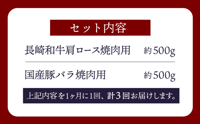 | 容量 | 下記容量を毎月1回、定期便の数に合わせてお送りいたします。 ・長崎和牛肩ロース焼肉用 500g ・国産豚バラ焼肉用 500g |