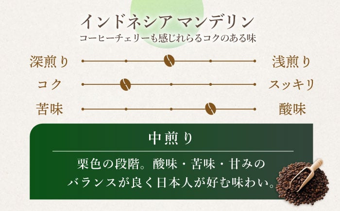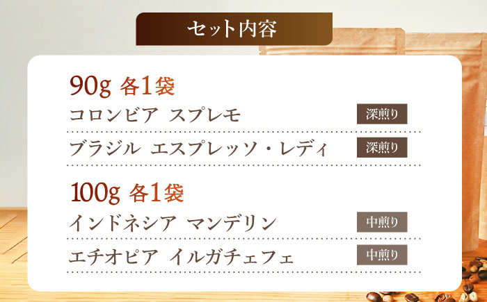 | 容量 | 下記容量が毎月一回、定期便の数に合わせてお送りいたします。 ○内容 【90g/袋×各1袋】 ・コロンビア スプレモ(深煎り) ・ブラジル エスプレッソ・レディ(深煎り) 【100g/袋×各1袋】 ・インドネシア マンデリン(中煎り) ・エチオピア イルガチェフェ(中煎り) 【加工地】 西海市 |