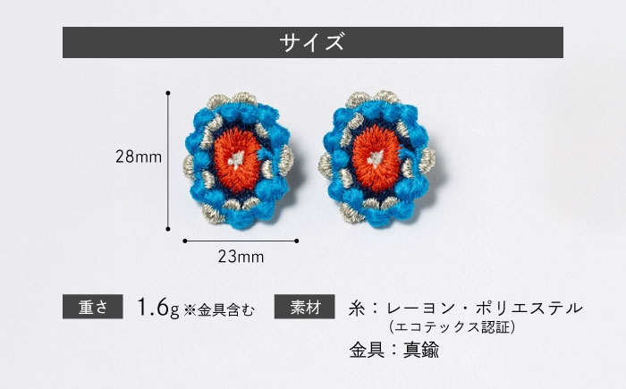 | 容量 | 【重さ】 1.6g(イヤリング)※金具含む 【サイズ】 W23mm/H28mm 【素材】 ・糸 レーヨン・ポリエステル(エコテックス認証) ・金具 真鍮 【加工地】 長崎県西海市 |