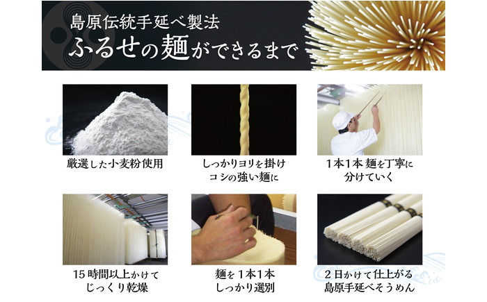雲仙山麓の上質な水を使い丹念に熟成を重ね出来上がった素麺。驚くほどのコシの強さに、ツヤツヤと光った小麦色の麺。 一度食べたら他の素麺が物足りないとの声も沢山いただいております。