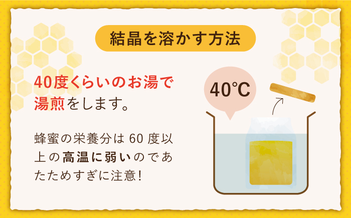 これは、蜂蜜内の糖類が結晶化するためです。決して、品質が低下しているわけではありません。結晶化する蜂蜜こそ、天然蜂蜜の証です。