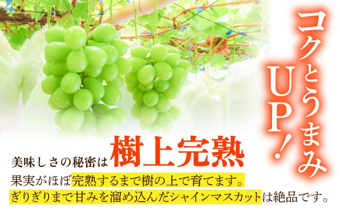 ・樹上完熟という方法で栽培した、糖度18度以上の「完熟シャインマスカット」です。