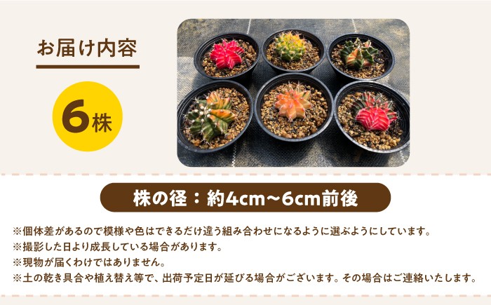 | 容量 | お届け個数:6株 株の径:約4cm~6cm前後 ※個体差があるので模様や色はできるだけ違う組み合わせになるように選ぶようにしています。 ※撮影した日より成長している場合があります。 ※現物が届くわけではありません。 ※土の乾き具合や植え替え等で、出荷予定日が延びる場合がございます。その場合はご連絡いたします。 【加工地】 長崎県長与町 |