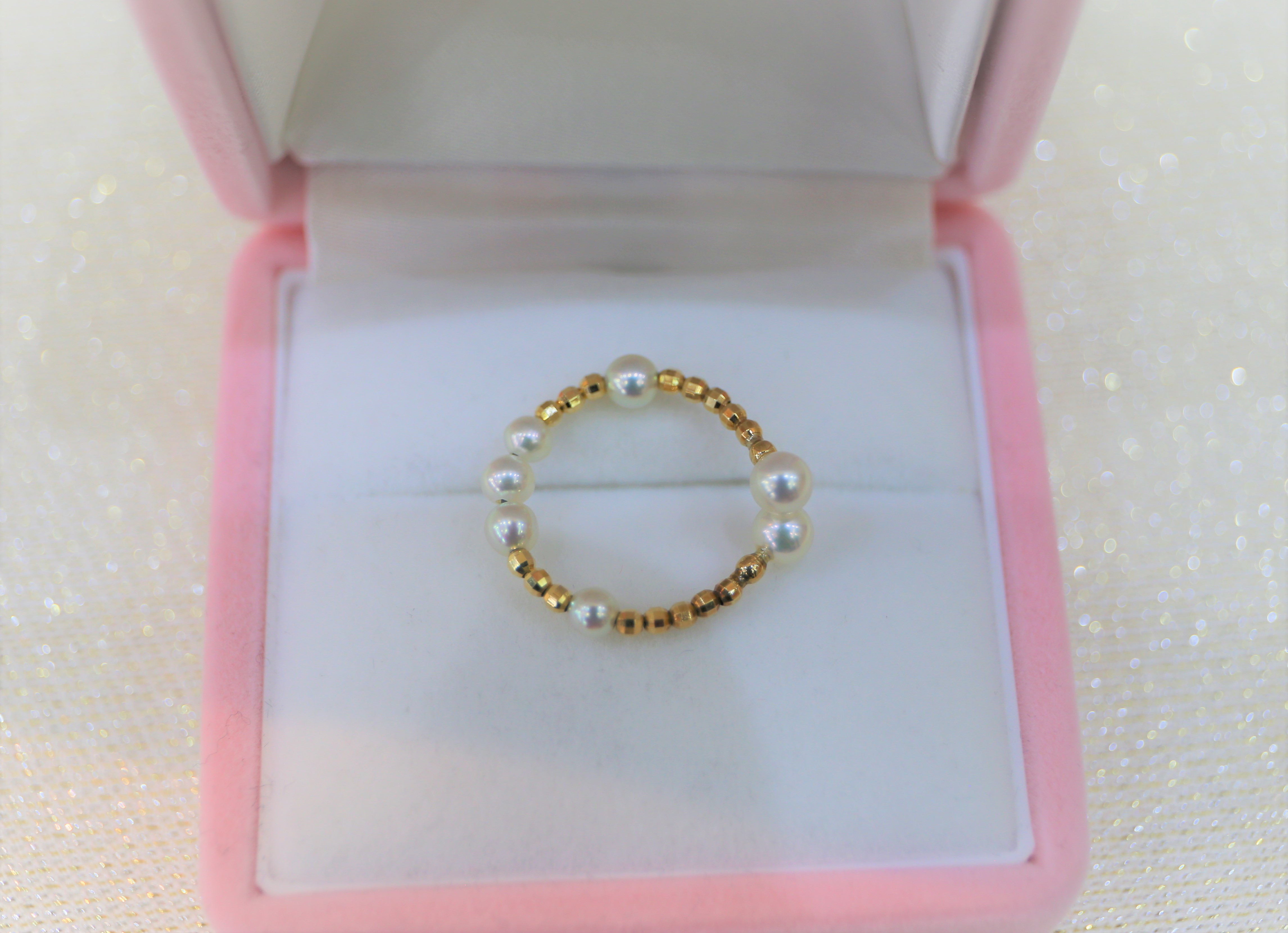 7つのベビーパールの間にK18ミラーボール並べた美しいリングです。