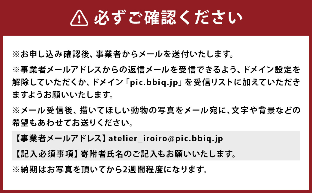 ・メール受信後、描いてほしい動物の写真をメール(atelier_iroiro@pic.bbiq.jp)宛に、文字や背景などの希望もあわせてお送りください。