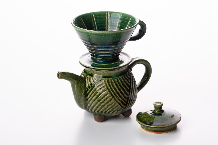 手仕事の温もり、心安らぐ一杯。抱星窯のコーヒーセット コーヒー陶器 ドリッパー コーヒーポット&ドリッパー8点セット コーヒーカップ3個 ソーサー3個 織部釉 [抱星窯 長崎県 東彼杵町 hs42bag390005] コーヒー 陶器 土物 グリーン 濃緑